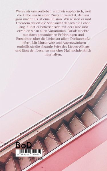Wenn wir uns verlieben, sind wir euphorisch, weil die Liebe uns in einen Zustand versetzt, der uns ganz macht. Es ist eine Illusion. Wir wissen es und trotzdem dauert die Sehnsucht danach ein Leben lang. Künstler befassen sich mit der Liebe und erzählen sie in allen Variationen. Parlak möchte mit ihren persönlichen Erfahrungen und Einsichten über die Liebe vor allem Denkanstöße liefern. Mit Mutterwitz und Augenzwinkern enthüllt sie die absurde Seite des Liebes-Alltags und lässt den Leser so manches Mal nachdenklich innehalten.
