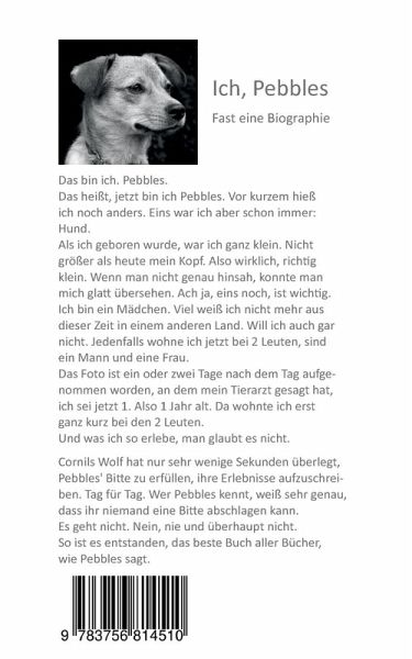 Ich, PebblesEin junger Straßenhund wurde von Tierfreunden in Rumänien aufgegriffen und nach Deutschland gebracht. Hier beginnt nun sein Leben ganz neu. Die meist grausamen Erlebnisse eines Straßenhundes werden angedeutet, aber absichtlich nicht geschildert. Die Andeutungen mit Inhalt zu füllen, wird der Phantasie des Lesers überlassen. In Deutschland angekommen beginnt das Hundeglück mit einem neuen Namen und dem Leben in einer Familie. Der Hund, im übrigen eine Hündin, heißt nun Pebbles. Ein sehr passender Name für die beginnende Vielfalt von Pebbles' täglichen Erlebnissen. Ihre Gedanken, Wünsche und Handlungen schildert Pebbles - erzählt und aufgezeichnet von ihrem Freund Cornils Wolf - in dem ihr ganz eigenem Sprachstil punktgenau treffend. Die täglichen Erlebnisse reiht sie in 45 Einzelgeschichten unbewußt aber sorgfältig in ihre Erfahrungen ein und hält dabei ebenso unbewußt jedem den Spiegel vor. Die durch viel Situationskomik und auch ein wenig Satire lebhaften Kapitel führen den Leser in die besondere Notlage, das Buch erst zuklappen zu können, wenn alle Kapitel nacheinander gelesen sind. Die Geschichten sind in besonderer Weise alle lustig und ernsthaft zugleich. Nie albern oder plump. Pebbles' Buch soll Spaß und Freude bereiten, es ist kein Kinderbuch, kein Buch für Erwachsene, kein Ratgeber für Hundefreunde. Es sind einfach nur die Dinge, die immer und überall jedem begegnen werden oder bereits begegnet sind. Pebbles' Buch bleibt jedem Leser stets in Erinnerung, und viele werden zu vielen Begebenheiten sagen, guck nach bei Pebbles', was sie dazu gesagt hat. Und Pebbles hat immer etwas dazu gesagt - auf 147 Seiten.
