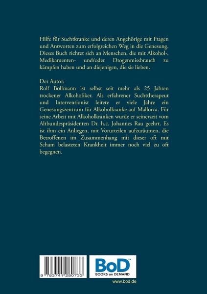 Rolf Bollmann ist selbst seit mehr als 25 Jahren trockener Alkoholiker. Als erfahrener Suchttherapeut und Interventionist (ausgebildet von Dr. med. Joseph Purch,, FAA Director, Californien, USA) leitete er viele Jahre ein Genesungszentrum für Alkoholkranke auf Mallorca. Für seine Arbeit mit Alkoholkranken wurde Rolf Bollmann seinerzeit vom Altbundespräsidenten Dr. h.c. Johannes Rau geehrt. Auch im fortgeschrittenen Alter und inzwischen im Ruhestand setzt er sich unermüdlich für die Bekämpfung, Vorbeugung und Vermeidung von Alkoholismus ein. Auch ist es ihm ein Anliegen, mit Vorurteilen aufzuräumen, die Betroffenen im Zusammenhang mit dieser oft mit Scham belasteten Krankheit immer noch viel zu oft begegnen.