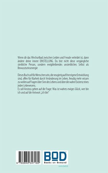 Dieses Buch soll für Menschen sein, die neugierig auf ihre eigene Entwicklung sind, offen für Klarheit durch Veränderung im Leben, freudig mehr wissen zu wollen auf Fragen über Sinn des Lebens und über die wahre Existenz eines jeden Lebewesens. Es soll Anstoss geben auf die Frage: Was ist wahres ewiges Glück, wer bin ich und auf die Antwort "Ich bin"
