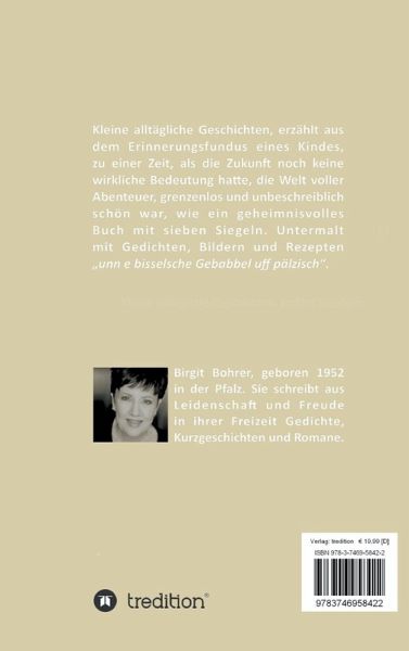 Kleine alltägliche Geschichten, erzählt aus dem Erinnerungsfundus eines Kindes, zu einer Zeit, als die Zukunft noch keine wirkliche Bedeutung hatte, die Welt voller Abenteuer, grenzenlos und unbeschreiblich schön war; wie ein geheimnisvolles Buch mit sieben Siegeln.Untermalt mit Gedichten, Bildern und Rezepten "unn e bisselsche Gebabbel uff pälzisch".