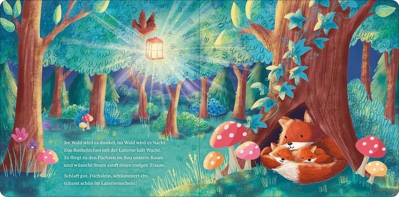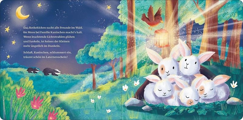 Begleite das Rotkehlchen auf seiner nächtlichen Reise durch den Wald. Mit seinem warmen Laternenlicht begleitet es liebevoll alle großen und kleinen Waldbewohner ins Land der Träume. Von den Füchsen über die Rehe am Waldrand bis hin zur Entenfamilie auf dem Teich - jedem schenkt das Rotkehlchen ein Gutenachtlicht, das Geborgenheit und Wärme spendet. Das Pappbilderbuch eignet sich perfekt für Kinder ab 6 Monaten und macht das Einschlafritual zu einem liebevollen Erlebnis für alle Sinne.