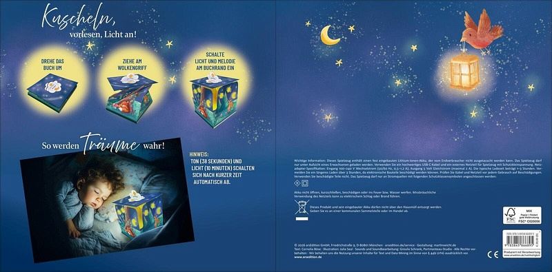 Liebevolle Einschlafbegleitung: Das Einschlafbuch mit integrierter Laterne unterstützt das abendliche Ritual mit sanftem Licht und beruhigender Melodie.Einzigartiger Überraschungseffekt: Buch verwandelt sich in Nachttischlaterne Alle Sinne werden angesprochen: Vorlesen, Kuscheln, Licht und Musik schaffen ein ganzheitliches Erlebnis.Automatisches Abschalten von Ton und Licht: Die Gutenachtmelodie endet nach 38 Sekunden, das Licht schaltet sich nach 10 Minuten automatisch aus - für sicheren und entspannten Schlaf.Schonende Lautstärke: Die Gutenachtmelodie von "Schlaf, Kindlein, schlaf" wird in angenehmer Lautstärke speziell für empfindliche Kleinkindohren wiedergegebenPraktischer Ein-/Ausschalter: Ton und Licht lassen sich dank des Knopfs am Buchrand jederzeit ein- und ausschalten.Perfekt für kleine Kinderhände: Dicke Pappeseiten und handliches FormatGeprüfte Qualität: Das Buch unterliegt strengen Sicherheitsanforderungen und regelmäßigen Qualitätskontrollen nach europäischer Spielzeugsicherheitsrichtlinie