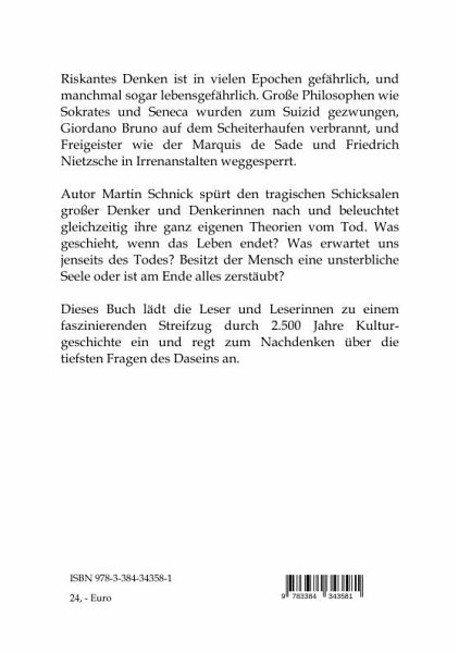 Riskantes Denken ist in vielen Epochen gefährlich, und manchmal sogar lebensgefährlich. Große Philosophen wie Sokrates und Seneca wurden zum Suizid gezwungen, Giordano Bruno auf dem Scheiterhaufen verbrannt, und Freigeister wie der Marquis de Sade und Friedrich Nietzsche in Irrenanstalten weggesperrt. Autor Martin Schnick spürt den tragischen Schicksalen großer Denker und Denkerinnen nach und beleuchtet gleichzeitig ihre ganz eigenen Theorien vom Tod. Was geschieht, wenn das Leben endet? Was erwartet uns jenseits des Todes? Besitzt der Mensch eine unsterbliche Seele oder ist am Ende alles zerstäubt?Dieses Buch lädt die Leser und Leserinnen zu einem faszinierenden Streifzug durch 2.500 Jahre Kulturgeschichte ein und regt zum Nachdenken über die tiefsten Fragen des Daseins an.