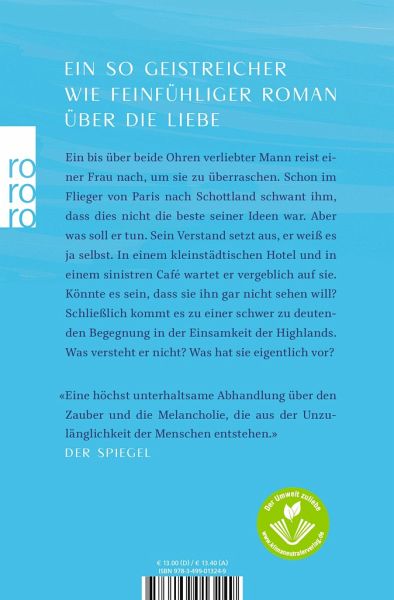 Wie in dem Bestseller Die Anomalie beginnt auch hier alles in einem Flugzeug. Ein bis über beide Ohren verliebter Mann sitzt im Flieger von Paris nach Schottland. Er reist einer Frau nach, um sie zu überraschen. Bald schon schwant ihm, dass dies nicht die beste seiner Ideen war. Denn sie hat ihn nicht eingeladen. Aber was soll er tun? Sein Verstand setzt aus, er weiß es ja selbst. In einem kleinstädtischen Hotel und in einem sinistren Café wartet er vergeblich auf sie. Könnte es sein, dass sie ihn überhaupt nicht sehen will? Schließlich kommt es zu einer schwer zu deutenden Begegnung in der Einsamkeit der Highlands. Was versteht er nicht? Was hat sie eigentlich vor? Er fühlt sich wie eins der vielen Schafe, die ihn anglotzen.