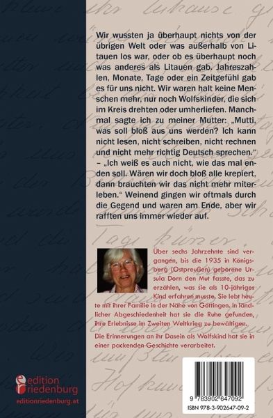 Über sechs Jahrzehnte sind vergangen, bis die 1935 in Königsberg (Ostpreußen) geborene Ursula Dorn den Mut fasste, das zu erzählen, was sie als 10-jähriges Kind erfahren musste. Sie lebt heute mit ihrer Familie in der Nähe von Göttingen. In ländlicher Abgeschiedenheit hat sie die Ruhe gefunden, ihre Erlebnisse im Zweiten Weltkrieg zu bewältigen. Die Erinnerungen an ihr Dasein als Wolfskind hat sie in einer packenden Geschichte verarbeitet.