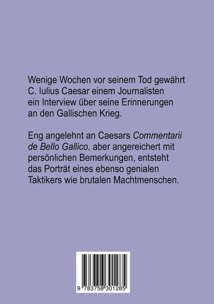 Wenige Wochen vor seiner Ermordung gewährt Caesar einem Journalisten ein Interview über seine Erinnerungen an den Gallischen Krieg.Eng angelehnt an Caesars "Commentarii de bello Gallico", aber angereichert mit persönlichen Bemerkungen, entsteht das Porträt eines genialen Taktikers und brutalen Machtmenschen.