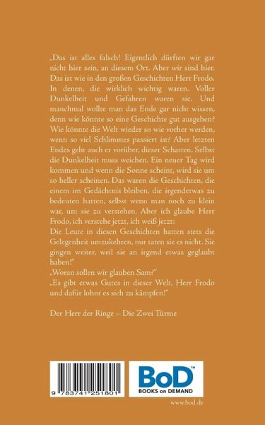 "Das ist alles falsch! Eigentlich dürften wir gar nicht hier sein, an diesem Ort. Aber wir sind hier. Das ist wie in den großen Geschichten, Herr Frodo. In denen, die wirklich wichtig waren. Voller Dunkelheit und Gefahren waren sie. Und manchmal wollte man das Ende gar nicht wissen, denn wie könnte so eine Geschichte gut ausgehen. Wie könnte die Welt wieder so wie vorher werden, wenn so viel Schlimmes passiert ist. Aber letzten Endes geht auch er vorüber, dieser Schatten. Selbst die Dunkelheit muss weichen. Ein neuer Tag wird kommen, und wenn die Sonne scheint, wird sie umso heller scheinen. Das waren die Geschichten, die einem im Gedächtnis bleiben, die irgendetwas zu bedeuten hatten, selbst wenn man noch zu klein war, um sie zu verstehen. Aber ich glaube, Herr Frodo, ich verstehe jetzt, ich weiß jetzt:Die Leute in diesen Geschichten hatten stets die Gelegenheit umzukehren, nur taten sie es nicht. Sie gingen weiter, weil sie an irgendetwas geglaubt haben!" "Woran sollen wir glauben Sam?""Es gibt etwas Gutes in dieser Welt, Herr Frodo, und dafür lohnt es sich zu kämpfen!"Der Herr der Ringe - Die Zwei Türme