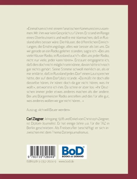 »Einmal kam ich mit einem fanatischen Kommunisten zusammen. Mit ihm war kein Gespräch zu führen. Er stand im Range eines Oberleutnants und wollte mir klarmachen, daß in Russland alles besser wäre. Die Häuser, die öffentlichen Einrichtungen, die Ernährungslage, alles war besser als bei uns. Da wir gerade an ein Radio gelehnt standen, sagte ich : »Bei uns viele Häuser Radio, in Russland auch ?« »Bei uns jeder Radio, nicht nur viele, jeder kann hören«. Erstaunt entgegnete ich, daß dies doch nicht möglich sein könne, davon hätte ich noch gar nichts gehört. Seine Stimme schwoll merklich an, als er mir erklärte, daß in Russland jedes Dorf einen Lautsprecher hätte, der auf dem Dorfplatz stünde. »Da müßt ihr doch alle dasselbe hören, ihr könnt doch da gar nicht hören, was ihr wollt«, antwortete ich ihm. Da schrie er aber los : »Ihr Deutschen immer jeder etwas anderes machen als der andere. Bei uns Bürgermeister Radio anstellen und das für alle gut, was anderes wollen wir gar nicht hören... «Auszug: »Ich will Bauer werden«
