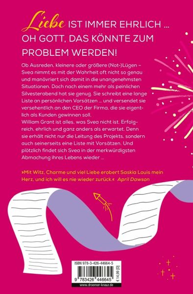 Svea Nussbaum ist 31 Jahre alt, unglücklich verliebt ... und nicht immer ganz ehrlich. Was sie leider zur Meisterin unangenehmer Situationen und Ausreden macht. Doch nach einem mehr als peinlichen Silvesterabend hat sie genug. Sie schreibt eine lange Liste an Vorsätzen, die persönlicher kaum sein könnte. Dumm nur, dass sie versehentlich anstelle eines Arbeitsdokuments ebendiese Liste an den CEO der Firma schickt, die sie eigentlich als Kunden gewinnen soll. William Grant ist alles, was sie nicht ist. Ehrlich, erfolgreich ... und ganz anders, als Svea erwartet hätte. Denn nicht nur betraut der charmante Firmenchef sie dennoch mit der Leitung des Projekts, sondern schickt ihr darüber hinaus auch eine eigene Liste an Vorsätzen. Und plötzlich findet sich Svea in der merkwürdigsten Abmachung ihres Lebens wieder ...