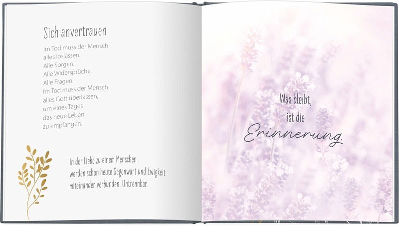 Optisch überzeugt das Buch durch seine hochwertige Gestaltung: Stimmungsvolle Naturfotografien und zarte Illustrationen, kunstvoll ergänzt durch edle Transparentpapierseiten, schaffen eine ruhige, tröstliche Atmosphäre. Die Goldfolienveredelung auf dem Cover verleiht dem Buch zusätzlich eine würdevolle, hochwertige Ausstrahlung - ideal als stilvolles Kondolenzgeschenk mit persönlicher Widmung.