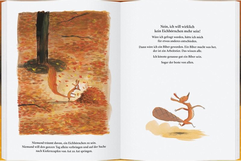 Im Buch geht es um ein Eichhörnchen, welches plötzlich kein Eichhörnchen mehr sein möchte. Eigentlich wollte es nie ein Eichhörnchen sein, aber es wurde dazu ja nie gefragt. Viel lieber wollte es ein Biber sein und das Eichhörnchen ist sicher, dass es einer der besten Biber sein würde. Doch als das Eichhörnchen merkt wie anstrengend die Arbeit als Biber ist, möchte es doch kein Biber mehr sein, sondern lieber ein..