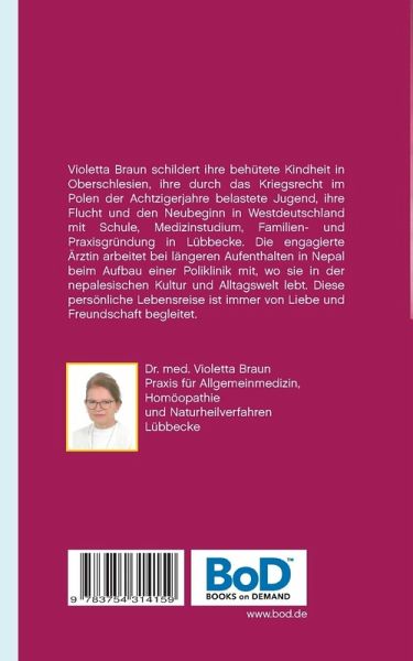 Violetta Braun schildert ihre behütete Kindheit in Oberschlesien, ihre durch das Kriegsrecht im Polen der Achtzigerjahre belastete Jugend, ihre Flucht und den Neubeginn in Westdeutschland mit Schule, Medizinstudium, Familien- und Praxisgründung in Lübbecke. Die engagierte Ärztin arbeitet bei längeren Aufenthalten in Nepal beim Aufbau einer Poliklinik mit, wo sie in der nepalesischen Kultur und Alltagswelt lebt. Diese persönliche Lebensreise ist immer von Liebe und Freundschaft begleitet.