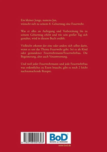 Ein kleiner Junge namens Jan, wünscht sich zu seinem 8. Geburtstag eine Feuerwehr.Was er alles an Aufregung und Vorbereitung bis zu seinem Geburtstag erlebt und wie sein großer Tag sich gestaltet, wird in diesem Buch erzählt.Vielleicht erkennt der eine oder andere sich selbst darin, wenn es um das Thema Feuerwehr geht. Sei es als Kind oder gestandener Feuerwehrmann/Feuerwehrfrau. Die Begeisterung, aber auch Verantwortung. Und weil jeder Feuerwehrmann und jede Feuerwehrfrau was ordentliches zu Essen braucht, gibt es noch 2 leicht nachzumachende Rezepte.