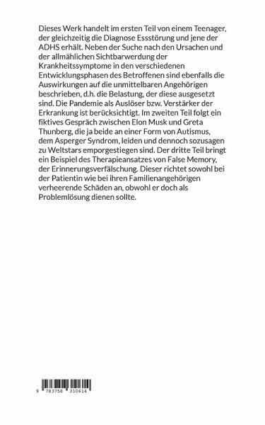 Dieses Werk handelt im ersten Teil von einem Teenager, der gleichzeitig die Diagnose Essstörung und jene der ADHS erhält. Neben der Suche nach den Ursachen und der allmählichen Sichtbarwerdung der Krankheitssymptome in den verschiedenen Entwicklungsphasen des Betroffenen sind ebenfalls die Auswirkungen auf die unmittelbaren Angehörigen beschrieben, d.h. die Belastung, der diese ausgesetzt sind. Die Pandemie als Auslöser bzw. Verstärker der Erkrankung ist berücksichtigt. Im zweiten Teil folgt ein fiktives Gespräch zwischen Elon Musk und Greta Thunberg, die ja beide an einer Form von Autismus, dem Asperger Syndrom, leiden und dennoch sozusagen zu Weltstars emporgestiegen sind. Der dritte Teil bringt ein Beispiel des Therapieansatzes von False Memory, der Erinnerungsverfälschung. Dieser richtet sowohl bei der Patientin wie bei ihren Familienangehörigen verheerende Schäden an, obwohl er doch als Problemlösung dienen sollte.