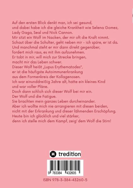 Auf den ersten Blick denkt man, ich sei gesund, und dabei habe ich die gleiche Krankheit wie Selena Gomez, Lady Gaga, Seal und Nick Cannon. Mir sitzt ein Wolf im Nacken, der mir oft die Kraft nimmt. Schaut über die Schulter, geht neben mir - ich spüre, er ist da. Und manchmal steht er mir dann direkt gegenüber, fordert mich raus, es mit ihm aufzunehmen. Dieser Wolf heißt "Lupus Erythematodes", er ist die häufigste Autoimmunerkrankung aus dem Formenkreis der Kollagenosen. Ich war einunddreißig Jahre alt, hatte ein kleines Kind und war voller Pläne. Doch dann schlich sich dieser Wolf bei mir ein. Der Wolf und die Fatigue. Sie brachten mein ganzes Leben durcheinander. Aber ich wollte mich nie arrangieren mit diesen beiden, nicht mit der Erkrankung und nicht mit dieser lähmenden Erschöpfung. Heute bin ich glücklich und viel stärker, denn ich stelle mich dem Kampf, zeig' dem Wolf die Stirn! Was da passiert ist, vom absoluten Tiefpunkt zu mehr Kraft und Energie, mehr Mut und Willen - davon handelt dieses Buch.