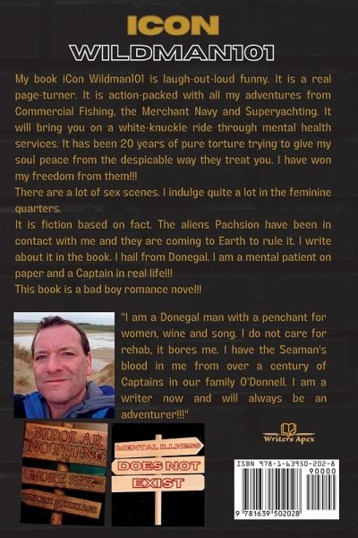 My book iCon Wildman101 is laugh-out-loud funny. It is a real page-turner. It is action-packed with all my adventures from Commercial Fishing, the Merchant Navy and Superyachting. It will bring you on a white-knuckle ride through mental health services. It has been 20 years of pure torture trying to give my soul peace from the despicable way they treat you. I have won my freedom from them!!! There are a lot of sex scenes. I indulge quite a lot in the feminine quarters. It is fiction based on fact. The aliens Pachsion have been in contact with me and they are coming to Earth to rule it. I write about it in the book. I hail from Donegal. I am a mental patient on paper and a Captain in real life!!! This book is a bad boy romance novel!!