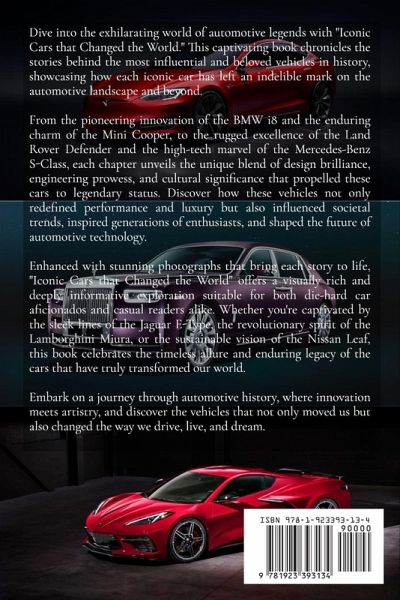 Dive into the exhilarating world of automotive legends with "Iconic Cars that Changed the World." This captivating book chronicles the stories behind the most influential and beloved vehicles in history, showcasing how each iconic car has left an indelible mark on the automotive landscape and beyond. From the pioneering innovation of the BMW i8 and the enduring charm of the Mini Cooper, to the rugged excellence of the Land Rover Defender and the high-tech marvel of the Mercedes-Benz S-Class, each chapter unveils the unique blend of design brilliance, engineering prowess, and cultural significance that propelled these cars to legendary status. Discover how these vehicles not only redefined performance and luxury but also influenced societal trends, inspired generations of enthusiasts, and shaped the future of automotive technology. Enhanced with stunning photographs that bring each story to life, "Iconic Cars that Changed the World" offers a visually rich and deeply informative exploration suitable for both die-hard car aficionados and casual readers alike. Whether you're captivated by the sleek lines of the Jaguar E-Type, the revolutionary spirit of the Lamborghini Miura, or the sustainable vision of the Nissan Leaf, this book celebrates the timeless allure and enduring legacy of the cars that have truly transformed our world. Embark on a journey through automotive history, where innovation meets artistry, and discover the vehicles that not only moved us but also changed the way we drive, live, and dream.