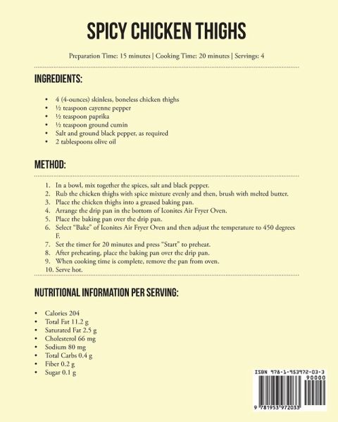 Effortless, yet crunchy Air Fryer recipes for your Iconites Oven! Taste the crispiness of frying without all the extra fat. Even on those busy after-work nights, a healthy, hot, mouthwatering meal is ready with considerably less effort and in a lot less time. These easy to follow Iconites Oven recipes accommodate nearly all tastes, occasions, and cooking styles - not just air frying - like bake, roast, slow cook, pizza, dehydrate, and more. Most recipes are budget-friendly and use easy-to-find ingredients. This easy, yet full of tasty Iconites Air Fryer Oven Cookbook has the following categories:Breakfast Poultry Red Meat Seafood Vegen Snacks Desserts From this cookbook you will learn:Iconites Air Fryer Toaster Oven Series The 10-IN-1 Multipurpose Air Fryer Oven How the Iconites Air Fryer Oven Works? Cleaning and Maintenance 30-Day Meal Plan Get a copy of this great Iconites Air Fryer Oven Cookbook and makes mouthwatering delicious easy for you to enjoy for every day!