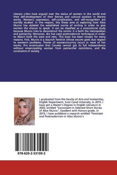 Literary critics have argued over the status of women in the world and their self-development of their literary and cultural position in literary works. Women's oppression, self-complication, and self-recognition are worldly studied. In this respect, this thesis aims at exploring how Alice Munro has violated the established norms of writing in order to give women the chance to speak. It can be classified as a postcolonial study because Munro tries to deconstruct the centre: it is both the metropolitan and patriarchy. Moreover, she has used postmodernist techniques in order to distort both the west and men. This topic has been chosen for many reasons. First, Munro is a staunch feminist whose oeuvre gives due respect to women's problems. Theme of woman/country recurs in most of her works; this accentuates that Canada cannot get its full independence without emancipating women from patriarchal restrictions, and the constraints of society.