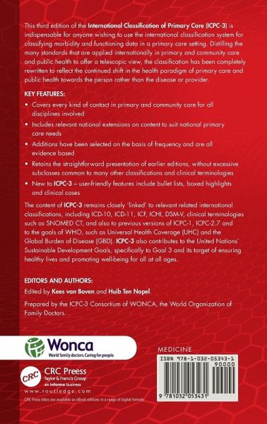 Foreword by Donald Li. Acknowledgements. Contributors. List of Acronyms. Introduction. Basic Principles: How the ICPC-3 Was Built. The Primary Care Use Case. Description, Inclusion, Exclusion, Coding Hint, Note, Index Terms and Cross References. Episodes of Care: A Central Concept in Primary Health Care. Standard for Use of Reason for Encounter. Standard for Use of Health Problems and Non- Disease- Related Care Episodes. Standard for Use of Functioning and Functioning Related. Standard for Use of Processes of Care (Interventions). Standard for Use of Regional Extensions, Emergency Codes and Extension Codes. Desk Version, Update Platform and Updates, Licensing of ICPC-3, Translations. Tabular List of ICPC-3 Classes. Conversion from ICPC-3 to ICPC-2 and ICPC-1. Annex 1: Primary Care Functioning Scale (PCFS). Index.