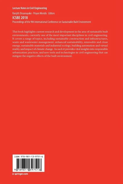 This book highlights current research and development in the area of sustainable built environments, currently one of the most important disciplines in civil engineering. It covers a range of topics, including sustainable construction and infrastructures, waste and wastewater management, enhanced sustainability, renewable and clean energy, sustainable materials and industrial ecology, building automation and virtual reality, and impact of climate change. As such it provides vital insights into responsible urbanization practices, and new tools and technologies in civil engineering that can mitigate the negative effects of the built environment.