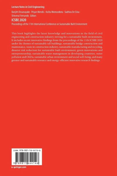 This book highlights the latest knowledge and innovations in the field of civil engineering and construction industry striving for a sustainable built environment. It includes recent innovative findings from the proceedings of the 11th ICSBE 2020 under the themes of sustainable tall buildings, sustainable bridge construction and maintenance, waste in construction industry, sustainable manufacturing and recycling, disaster risk reduction for sustainable built environment, green innovations and entrepreneurship, sustainable water management in developing countries, water pollution and CKDu, sustainable urban environment and social well-being, and many greener and sustainable resource and energy-efficient innovative research findings.