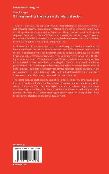 This book investigates the impact of production input factors on the market, consumer and producer energy demand characteristics in 30 industrial sectors for South Korea over the period 1980-2009, and for Japan over the period 1973-2006, with special emphasis placed on the effects of ICT investment on the demand for energy. A dynamic factor demand model is developed, accounting for the adjustment costs that are defined in terms of forgone output from current production.