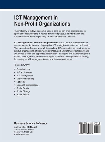 The instability of today's economic climate calls for non-profit organizations to approach social problems in new and interesting ways, and Information and Communication Technologies may serve as an answer to this call. ICT Management in Non-Profit Organizations aims to explore the effective and comprehensive deployment of appropriate ICT strategies within the nonprofit sector. This innovative reference work will discuss how ICT enables the non-profit sector to achieve organizational efficiency, effectiveness, and, ultimately, self sufficiency, and will provide elected and appointed policymakers, managers, and planners in governments, public agencies, and nonprofit organizations with a comprehensive strategy for creating an ICT management agenda in the non-profit sector.