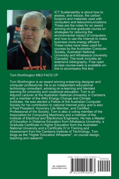 ICT Sustainability is about how to assess, and reduce, the carbon footprint and materials used with computers and telecommunications. These are the notes for an award winning on-line graduate course on strategies for reducing the environmental impact of computers and how to use the Internet to make business more energy efficient. These notes have been used for courses by the Australian Computer Society, Australian National University and Athabasca University (Canada). The book includes an extensive bibliography. Free open access course-ware is available on-line to accompany this text.