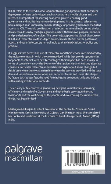 Juxtaposes the global discourse on ICT-D with in-depth case studies on the pattern of access and use of telecentres to draw implications for the possible development trajectories induced by the provision of ICTs in rural hinterlands of India.