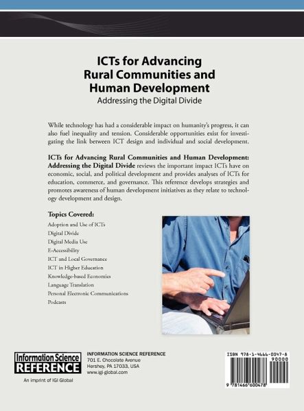 While technology has had a considerable impact on humanity's progress, it can also fuel inequality and tension. Considerable opportunities exist for investigating the link between ICT design and individual and social development. ICTs for Advancing Rural Communities and Human Development: Addressing the Digital Divide reviews the important impact ICTs have on economic, social, and political development and provides analyses of ICTs for education, commerce, and governance. This reference develops strategies and promotes awareness of human development initiatives as they relate to technology development and design.