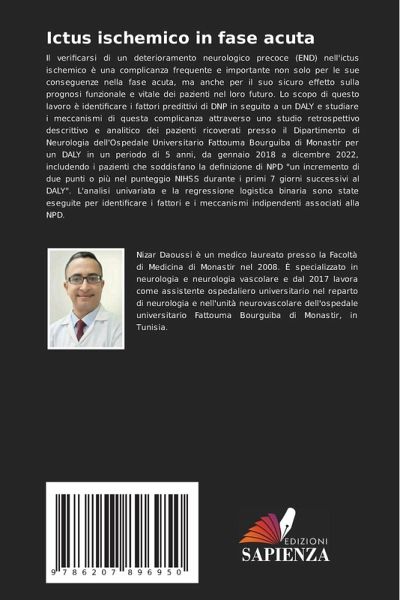 Il verificarsi di un deterioramento neurologico precoce (END) nell'ictus ischemico è una complicanza frequente e importante non solo per le sue conseguenze nella fase acuta, ma anche per il suo sicuro effetto sulla prognosi funzionale e vitale dei pazienti nel loro futuro. Lo scopo di questo lavoro è identificare i fattori predittivi di DNP in seguito a un DALY e studiare i meccanismi di questa complicanza attraverso uno studio retrospettivo descrittivo e analitico dei pazienti ricoverati presso il Dipartimento di Neurologia dell'Ospedale Universitario Fattouma Bourguiba di Monastir per un DALY in un periodo di 5 anni, da gennaio 2018 a dicembre 2022, includendo i pazienti che soddisfano la definizione di NPD "un incremento di due punti o più nel punteggio NIHSS durante i primi 7 giorni successivi al DALY". L'analisi univariata e la regressione logistica binaria sono state eseguite per identificare i fattori e i meccanismi indipendenti associati alla NPD.