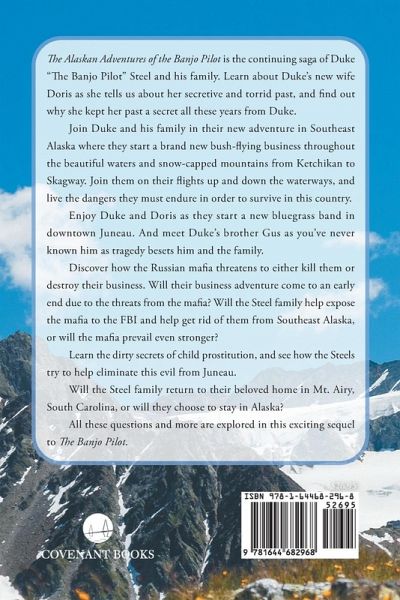The Alaskan Adventures of the Banjo Pilot is the continuing saga of Duke "The Banjo Pilot" Steel and his family. Learn about Duke's new wife Doris as she tells us about her secretive and torrid past, and find out why she kept her past a secret all these years from Duke. Join Duke and his family in their new adventure in Southeast Alaska where they start a brand new bush-flying business throughout the beautiful waters and snow-capped mountains from Ketchikan to Skagway. Join them on their flights up and down the waterways, and live the dangers they must endure in order to survive in this country. Enjoy Duke and Doris as they start a new bluegrass band in downtown Juneau. And meet Duke's brother Gus as you've never known him as tragedy besets him and the family. Discover how the Russian mafia threatens to either kill them or destroy their business. Will their business adventure come to an early end due to the threats from the mafia? Will the Steel family help expose the mafia to the FBI and help get rid of them from Southeast Alaska, or will the mafia prevail even stronger? Learn the dirty secrets of child prostitution, and see how the Steels try to help eliminate this evil from Juneau. Will the Steel family return to their beloved home in Mt. Airy, South Carolina, or will they choose to stay in Alaska? All these questions and more are explored in this exciting sequel to The Banjo Pilot.