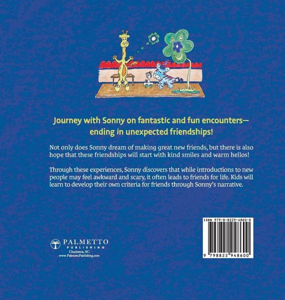 New Reduced Price for the Holiday Season makes it easier to help the child in your life meet Sonny the Giraffe and discover the joys of making friends and overcoming their nervous feelings about meeting someone new. This charming children's book, filled with fun adventures and new friendships, makes a wonderful holiday gift. Grab your copy today and let the little ones enjoy a heartwarming story this season with Sonny and his friends! Meet Sonny: a giraffe with a great long neck, a happy disposition, and a little bit of nervousness when it comes to meeting new people. You see, Sonny dreams of making friends but is a bit shy and gets a little nervous sometimes. Nonetheless Sonny is determined to set out to meet someone new. Journey with Sonny on fantastic and fun encounters-ending in unexpected friendships! Not only does Sonny dream of making great new friends, but there is also hope that these friendships will start with kind smiles and warm hellos! Within the book, children will discover through brightly colored fun and fanciful illustrations of Sonny with all the new friends an overarching lesson about learning to connect with people from all walks of life. Through a variety of experiences, Sonny discovers that while introductions to new people may feel awkward and scary, it often leads to friends for life. Kids will learn to develop their own criteria for friends through Sonny's narrative, including people who:Like to share. Are joyful and warm. Act brave and curious. Have different talents. Smile often. I'd Like To Meet Someone New Today is a great starter book for toddlers and early readers with vivid colors, fanciful scenarios, and relatable fun characters. And the easy-to-read rhymes make Sonny's story an engaging book, sure to be chosen again and again for a bedtime read.