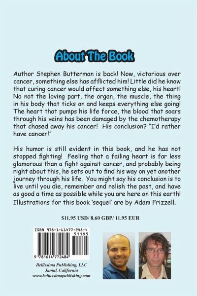 Author Stephen Butterman is back! Now, victorious over cancer, something else has afflicted him! Little did he know that curing cancer would affect something else, his heart! No not the loving part, the organ, the muscle, the thing in his body that ticks on and keeps everything else going! The heart that pumps his life force, the blood that soars through his veins has been damaged by the chemotherapy that chased away his cancer! His conclusion? "I'd rather have cancer!" His humor is still evident in this book, and he has not stopped fighting! Feeling that a failing heart is far less glamorous than a fight against cancer, and probably being right about this, he sets out to find his way on yet another journey through his life. You might say his conclusion is to live until you die, remember and relish the past, and have as good a time as possible while you are here on this earth! Illustrations for this book 'sequel' are by Adam Frizzell.