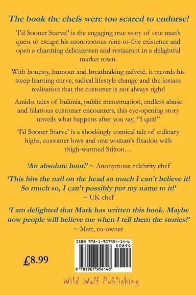 'I'd Sooner Starve!' is the engagingly true story of one man's quest to escape his monotonous nine-to-five existence and open a charming delicatessen and restaurant in a delightful market town. With naked honesty and occasional breathtaking naïveté, it records his arduous journey and painful reappraisal that customers are always right. Amidst tales of bulimia, public menstruation and day-to-day abuse, this tragic story is an eye-opening account of what happens after you say "I quit!" A warning to some or entertainment to others, 'I'd Sooner Starve!' is a shockingly comical account of culinary highs, customer lows and one woman's fixation with thigh-warmed Stilton.