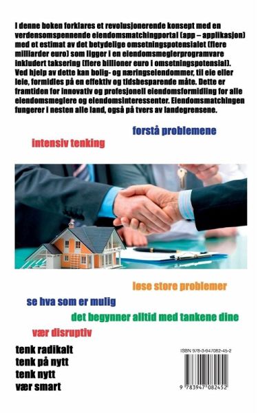 I denne boken forklares et revolusjonerende konsept med en verdensomspennende eiendomsmatchingportal (app - applikasjon) med et estimat av det betydelige omsetningspotensialet (flere milliarder euro) som ligger i en eiendomsmeglerprogramvare inkludert taksering (flere billioner euro i omsetningspotensial). Ved hjelp av dette kan bolig- og næringseiendommer, til eie eller leie, formidles på en effektiv og tidsbesparende måte. Dette er framtiden for innovativ og profesjonell eiendomsformidling for alle eiendomsmeglere og eiendomsinteressenter. Eiendomsmatchingen fungerer i nesten alle land, også på tvers av landegrensene. I stedet for å «bringe» eiendommer til kjøperen eller leieren kvalifiseres eiendomsinteressentene i eiendomsmatchingportalen (søkeprofil) og sammenstilles med og knyttes til eiendommene som eiendomsmeglerne vil formidle.