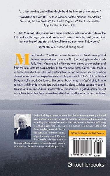 Meet Ida Mae. You'll learn to love her as she evolves from a spirited thirteen-year-old into a woman, first journeying from Mammoth Falls, West Virginia, to Pitt University on a music scholarship, and from there to Vietnam as a member of the Women's Army Corps. After the loss of her husband in Nam, the Ball Buster's Bash in San Francisco serves as a fine diversion, as does her experience as a salesperson at Holly's Hat on Rodeo Drive in Hollywood, California. She arrives back home in West Virginia in time to travel with friends to Woodstock. Eventually, along with her second husband, Dennis, and her son, Adrian, she travels to Chautauqua, a gated summer resort in northwestern New York, where her adventures and those of her son continue.