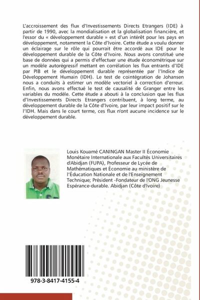 L accroissement des flux d Investissements Directs Etrangers (IDE) à partir de 1990, avec la mondialisation et la globalisation financière, et l'essor du " développement durable " est d un intérêt pour les pays en développement, notamment la Côte d Ivoire. Cette étude a voulu donner un éclairage sur le rôle qui pourrait être accordé aux IDE pour le développement durable de la Côte d Ivoire. Nous avons constitué une base de données qui a permis d effectuer une étude économétrique sur un modèle autorégressif mettant en corrélation les flux entrants d IDE par PIB et le développement durable représentée par l Indice de Développement Humain (IDH). Le test de cointégration de Johansen nous a conduits à estimer un modèle vectoriel à correction d erreur. Enfin, nous avons effectué le test de causalité de Granger entre les variables du modèle. Cette étude a abouti à la conclusion que les flux d Investissements Directs Etrangers contribuent, à long terme, au développement durable de la Côte d Ivoire, par leur impact positif sur le l IDH. Mais dans le court terme, ces flux n'ont aucune incidence sur le développement durable.