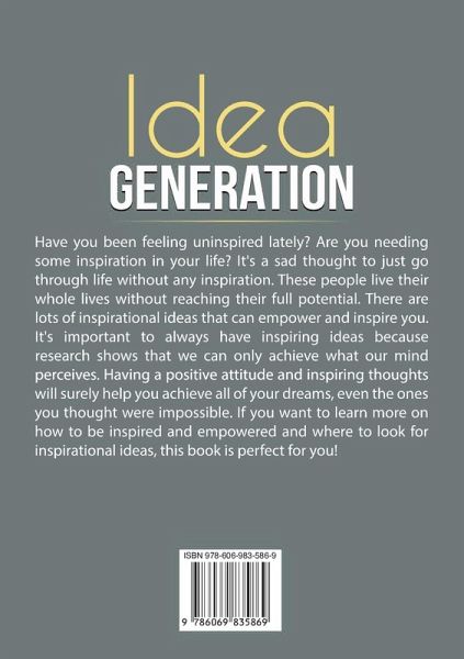 Idea Generation: The Ultimate Guide to Inspirational Ideas That Would Motivate You to Action, Discover the Empowered Thoughts and Wisdom of the Century That Would Absolutely Inspire You Have you been feeling uninspired lately? Are you needing some inspiration in your life? It's a sad thought to just go through life without any inspiration. These people live their whole lives without reaching their full potential. There are lots of inspirational ideas that can empower and inspire you. It's important to always have inspiring ideas because research shows that we can only achieve what our mind perceives. If you perceive that you will never amount to anything, then that is certainly what can become a reality. This book will teach you the different definitions of the word "inspired" and will teach you what an inspired idea really means. You will discover the many types of inspirational ideas that can empower you. But you will not only learn how to empower yourself but to inspire other people as well. You will also determine the factors that make a person lose inspiration so you will learn how to recognize it and avoid this situation. In this book, you will learn about the following topics: Inspirational Ideas and Empowerment Types of Inspirational Ideas Where to Find Inspiration How to Get Inspired and Empowered How to Make the Most Out of Inspirational Ideas Losing Your Inspiration Famous Inspirational Ideas That Have Changed the Course of History How To Use Inspirational Ideas to Empower Others An inspired person is a powerful person who is not only able to help himself but others as well. Having a positive attitude and inspiring thoughts will surely help you achieve all of your dreams, even the ones you thought were impossible. If you want to learn more on how to be inspired and empowered and where to look for inspirational ideas, scroll up and click "add to cart" now.