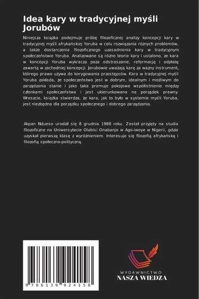 Niniejsza ksi¿¿ka podejmuje prób¿ filozoficznej analizy koncepcji kary w tradycyjnej my¿li afrykäskiej Yoruba w celu rozwi¿zania ró¿nych problemów, a tak¿e dostarczenia filozoficznego uzasadnienia kary w tradycyjnym spo¿ecze¿stwie Yoruba. Analizowane s¿ ró¿ne teorie kary i ustalono, ¿e kara w koncepcji Yoruba wykracza poza odstraszanie, reformacj¿ i odp¿at¿ zawart¿ w zachodniej koncepcji. Jorubowie uwäaj¿ kar¿ za wäny instrument, którego prawo u¿ywa do korygowania przest¿pców. Kara w tradycyjnej my¿li Yoruba zak¿ada, ¿e spo¿ecze¿stwo jest w dobrym, idealnym i mo¿liwym do zarz¿dzania stanie i jako taka promuje pokojowe wspó¿istnienie mi¿dzy cz¿onkami spo¿ecze¿stwa i jest ukierunkowana na porz¿dek prawny. Wreszcie, ksi¿¿ka stwierdza, ¿e kara, jak to by¿o w systemie my¿li Yoruba, jest niezb¿dna dla porz¿dku spo¿ecznego i dobrego zarz¿dzania.