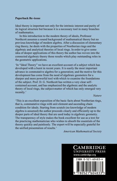 In this introduction to the modern theory of ideals, Professor Northcott first discusses the properties of Noetherian rings and the algebraic and analytical theories of local rings. In order to give some idea of deeper applications of this theory the author has woven into the connected algebraic theory those results which play outstanding roles in the geometric applications.