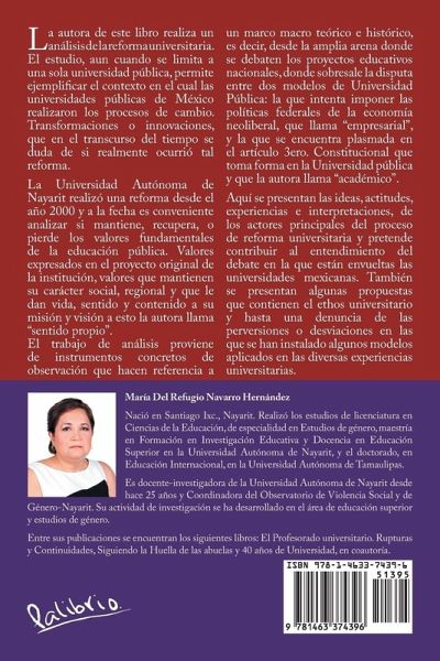La autora de este libro realiza un análisis de la reforma universitaria. El estudio, aun cuando se limita a una sola universidad pública, permite ejemplificar el contexto en el cual las universidades públicas de México realizaron los procesos de cambio. Transformaciones o innovaciones, que en el transcurso del tiempo se duda de si realmente ocurrió tal reforma. La Universidad Autónoma de Nayarit realizó una reforma desde el año 2000 y a la fecha es conveniente analizar si mantiene, recupera, o pierde los valores fundamentales de la educación pública. Valores expresados en el proyecto original de la institución, valores que mantienen su carácter social, regional y que le dan vida, sentido y contenido a su misión y visión a esto la autora llama "sentido propio". El trabajo de análisis proviene de instrumentos concretos de observación que hacen referencia a un marco macro teórico e histórico, es decir, desde la amplia arena donde se debaten los proyectos educativos nacionales, donde sobresale la disputa entre dos modelos de Universidad Pública: la que intenta imponer las políticas federales de la economía neoliberal, que llama "empresarial", y la que se encuentra plasmada en el artículo 3ero. Constitucional que toma forma en la Universidad pública y que la autora llama "académico". Aquí se presentan las ideas, actitudes, experiencias e interpretaciones, de los actores principales del proceso de reforma universitaria y pretende contribuir al entendimiento del debate en la que están envueltas las universidades mexicanas. También se presentan algunas propuestas que contienen el ethos universitario y hasta una denuncia de las perversiones o desviaciones en las que se han instalado algunos modelos aplicados en las diversas experiencias universitarias.
