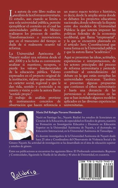 La autora de este libro realiza un análisis de la reforma universitaria. El estudio, aun cuando se limita a una sola universidad pública, permite ejemplificar el contexto en el cual las universidades públicas de México realizaron los procesos de cambio. Transformaciones o innovaciones, que en el transcurso del tiempo se duda de si realmente ocurrió tal reforma. La Universidad Autónoma de Nayarit realizó una reforma desde el año 2000 y a la fecha es conveniente analizar si mantiene, recupera, o pierde los valores fundamentales de la educación pública. Valores expresados en el proyecto original de la institución, valores que mantienen su carácter social, regional y que le dan vida, sentido y contenido a su misión y visión a esto la autora llama "sentido propio". El trabajo de análisis proviene de instrumentos concretos de observación que hacen referencia a un marco macro teórico e histórico, es decir, desde la amplia arena donde se debaten los proyectos educativos nacionales, donde sobresale la disputa entre dos modelos de Universidad Pública: la que intenta imponer las políticas federales de la economía neoliberal, que llama "empresarial", y la que se encuentra plasmada en el artículo 3ero. Constitucional que toma forma en la Universidad pública y que la autora llama "académico". Aquí se presentan las ideas, actitudes, experiencias e interpretaciones, de los actores principales del proceso de reforma universitaria y pretende contribuir al entendimiento del debate en la que están envueltas las universidades mexicanas. También se presentan algunas propuestas que contienen el ethos universitario y hasta una denuncia de las perversiones o desviaciones en las que se han instalado algunos modelos aplicados en las diversas experiencias universitarias.