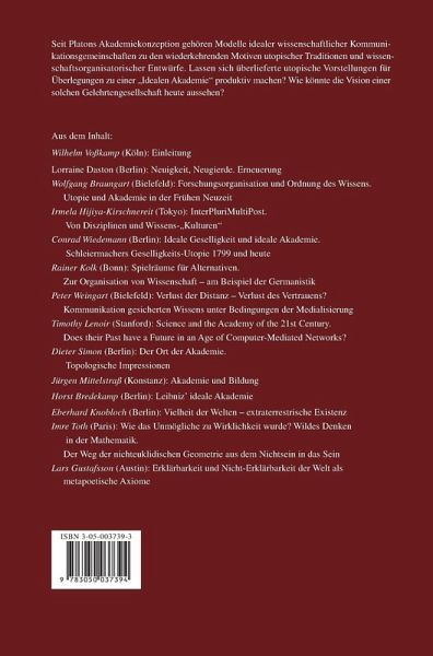 Wilhelm Voßkamp: Einleitung Wissenschaftsbegriff und Wissenschaftskonzeption Lorraine Daston: Neuigkeit, Neugierde, Erneuerung Wolfgang Braungart: Forschungsorganisation und Ordnung des Wissens. Utopie und Akademie in der Frühen Neuzeit Irmela Hijiya-Kirschnereit: InterPluriMulti-Post. Von Disziplinen und Wissenskulturen Organisation und Institutionalisierung Conrad Wiedemann: Ideale Geselligkeit und ideale Akademie. Schleiermachers Geselligkeits-Utopie 1799 und heute Rainer Kolk: Spielräume für Alternativen. Zur Organisation von Wissenschaft – am Beispiel der Germanistik Peter Weingart: Verlust der Distanz – Verlust des Vertrauens? Kommunikation gesicherten Wissens unter Bedingungen der Medialisierung Timothy Lenoir: Science and the Academy of the 21st Century: Does their Past have a Future in an Age of Computer-Mediated Networks? Dieter Simon: Der Ort der Akademie. Topologische Impressionen Funktionen und Anwendungserwartungen Jürgen Mittelstraß: Akademie und Bildung Horst Bredekamp: Leibniz’ Ideale Akademie Eberhard Knobloch: Vielheit der Welten – extraterrestrische Existenz Imre Toth: Wie das Unmögliche zu Wirklichkeit wurde? Wildes Denken in der Mathematik. Der Weg der nichteuklidischen Geometrie aus dem Nicht-Sein in das Sein Lars Gustafsson: Überblickbarkeit und Unüberblickbarkeit der Welt als poetische Axiome