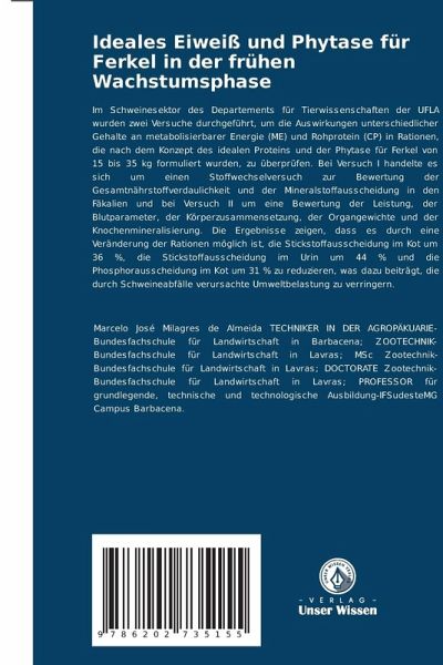 Im Schweinesektor des Departements für Tierwissenschaften der UFLA wurden zwei Versuche durchgeführt, um die Auswirkungen unterschiedlicher Gehalte an metabolisierbarer Energie (ME) und Rohprotein (CP) in Rationen, die nach dem Konzept des idealen Proteins und der Phytase für Ferkel von 15 bis 35 kg formuliert wurden, zu überprüfen. Bei Versuch I handelte es sich um einen Stoffwechselversuch zur Bewertung der Gesamtnährstoffverdaulichkeit und der Mineralstoffausscheidung in den Fäkalien und bei Versuch II um eine Bewertung der Leistung, der Blutparameter, der Körperzusammensetzung, der Organgewichte und der Knochenmineralisierung. Die Ergebnisse zeigen, dass es durch eine Veränderung der Rationen möglich ist, die Stickstoffausscheidung im Kot um 36 %, die Stickstoffausscheidung im Urin um 44 % und die Phosphorausscheidung im Kot um 31 % zu reduzieren, was dazu beiträgt, die durch Schweineabfälle verursachte Umweltbelastung zu verringern.