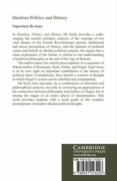 In Idealism, Politics and History, Mr Kelly provides a wide-ranging but careful scholarly analysis of the meeting of two vital themes in the French Revolutionary period: intellectual and moral perceptions of history, and the patterns of political systems. He argues that a close exploration of the former is critical to our understanding of political philosophy at the end of the Age of Reason. The author traces his central preoccupations in a series of linked studies of Rousseau, Kant, Fichte and Hegel. Each essay is in its own right an important contribution to the history of political ideas. Cumulatively, they furnish a context of thought in which Hegel's system of thought can be clarified and reinterpreted. Mr Kelly thus succeeds not only in conveying an appreciation of the connection between philosophy and politics in Hegel, but in tracing the stages of an entire school of interpretation.