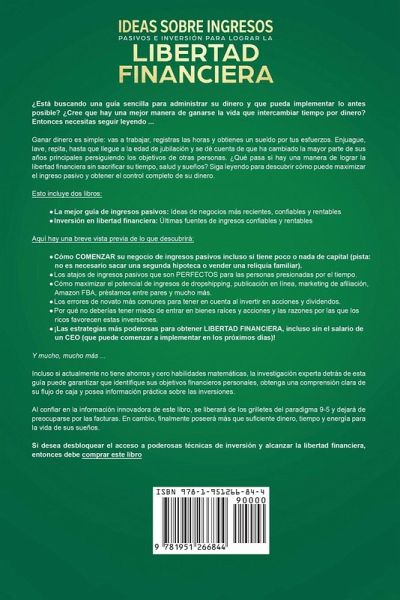 ¿Está buscando una guía sencilla para administrar su dinero y que pueda implementar lo antes posible? ¿Cree que hay una mejor manera de ganarse la vida que intercambiar tiempo por dinero? Entonces necesitas seguir leyendo ... Ganar dinero es simple: vas a trabajar, registras las horas y obtienes un sueldo por tus esfuerzos. Enjuague, lave, repita, hasta que llegue a la edad de jubilación y se dé cuenta de que ha cambiado la mayor parte de sus años principales persiguiendo los objetivos de otras personas. ¿Qué pasa si hay una manera de lograr la libertad financiera sin sacrificar su tiempo, salud y sueños? Siga leyendo para descubrir cómo puede maximizar el ingreso pasivo y obtener el control completo de su dinero. Esto incluye dos libros: La mejor guía de ingresos pasivos: Ideas de negocios más recientes, confiables y rentables Inversión en libertad financiera: Últimas fuentes de ingresos confiables y rentables Aquí hay una breve vista previa de lo que descubrirá: Cómo COMENZAR su negocio de ingresos pasivos incluso si tiene poco o nada de capital (pista: no es necesario sacar una segunda hipoteca o vender una reliquia familiar). Los atajos de ingresos pasivos que son PERFECTOS para las personas presionadas por el tiempo. Cómo maximizar el potencial de ingresos de dropshipping, publicación en línea, marketing de afiliación, Amazon FBA, préstamos entre pares y mucho más. Los errores de novato más comunes para tener en cuenta al invertir en acciones y dividendos. Por qué no deberías tener miedo de entrar en bienes raíces y acciones y las razones por las que los ricos favorecen estas inversiones. ¡Las estrategias más poderosas para obtener LIBERTAD FINANCIERA, incluso sin el salario de un CEO (que puede comenzar a implementar en los próximos días)! Y mucho, mucho más ... Incluso si actualmente no tiene ahorros y cero habilidades matemáticas, la investigación experta detrás de esta guía puede garantizar que identifique sus objetivos financieros personales, obtenga una comprensión clara de su flujo de caja y posea información práctica sobre las inversiones. Al confiar en la información innovadora de este libro, se liberará de los grilletes del paradigma 9-5 y dejará de preocuparse por las facturas. En cambio, finalmente poseerá más que suficiente dinero, tiempo y energía para la vida de sus sueños. Si desea desbloquear el acceso a poderosas técnicas de inversión y alcanzar la libertad financiera, entonces debe comprar este libro