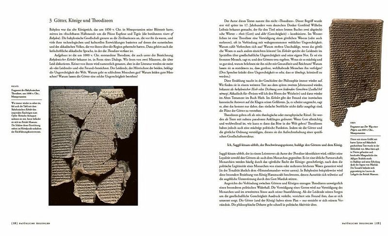In Kapitel 1 geht es um die frühe Periode von 2500 bis 300 v.Chr. Kapitel 2 befasst sich mit den Werken des persischen und mazedonischen Reiches, während sich Kapitel 3 der römischen Gesellschaft widmet. Kapitel 4 wendet sich dem „Goldenen Zeitalter des Islams“ zu. Kapitel 5 beleuchtet die Texte christlicher, islamischer und jüdischer Gelehrter zwischen 1000 und 1450; daran schließt sich der Zeitraum von 1450 bis 1850 mit seiner „Naturphilosophie“ an. Das Schlusskapitel betrachtet philosophische Themen mit Bezug auf Weltereignisse wie die Weltkriege, den Kalten Krieg, die Entkolonialisierung und Befreiung. Neben diesen interessanten Themen punktet die Publikation auch mit einer üppigen Illustration an historischen Abbildungen.